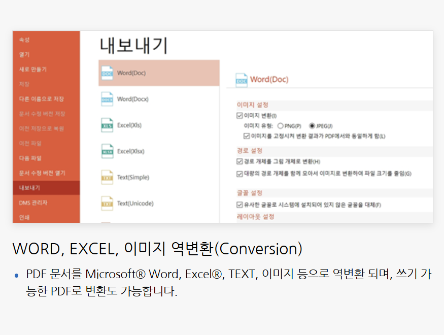 - 용량줄이기: 이미지 해상도 조절 등의 방식으로 PDF 용량 감소 가능
