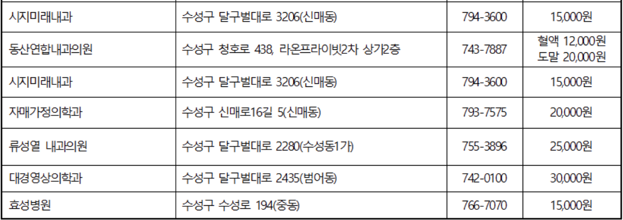 | 류성열내과의원 | 수성동1가 | 25,000원 | 혈액검사 3일, 도말 7일 |