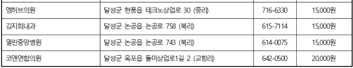 | 달서구 | 대곡제일내과, 푸르기정의원 (2일) |