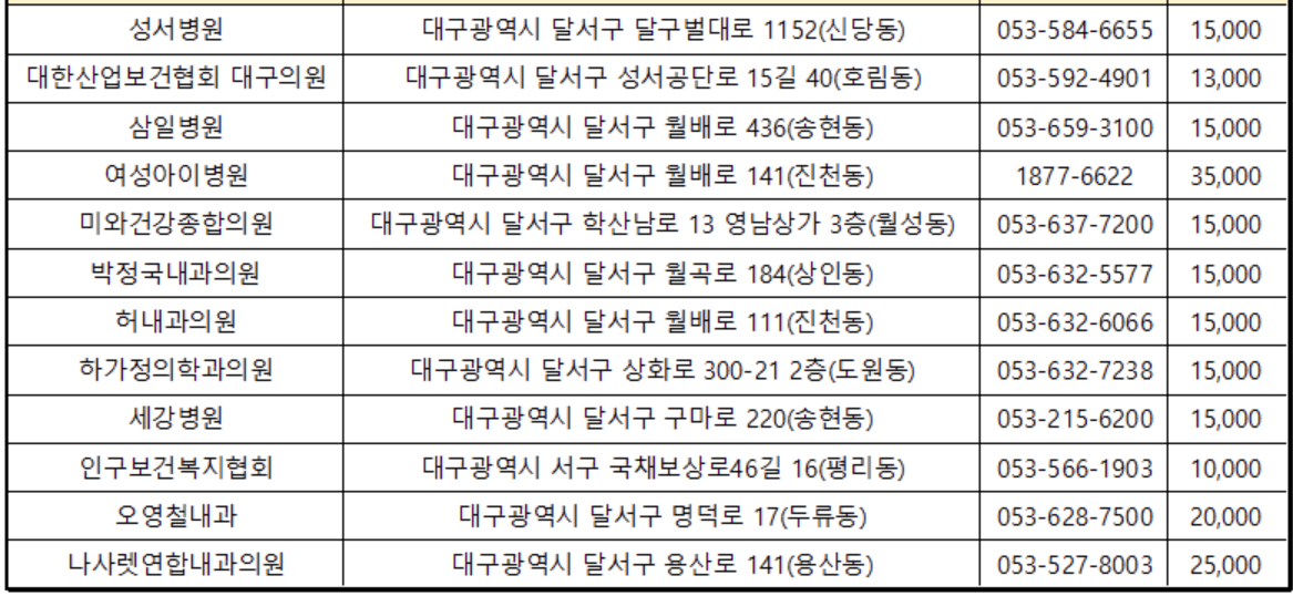 | 한국건강관리협회 대구지부 | 동구 신천동 | 15,000원 | 7일 |
