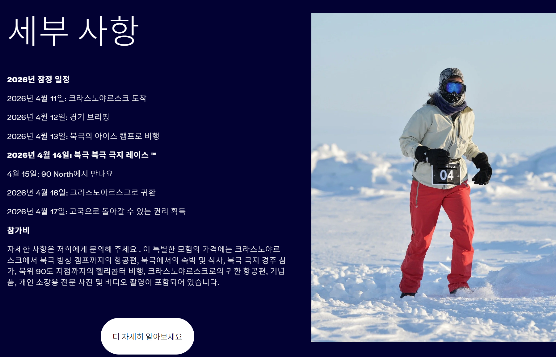 👉 북극점 레이스는 헬기 이동, 특수 보험, 장비 요구 때문에 비용이 가장 높음.