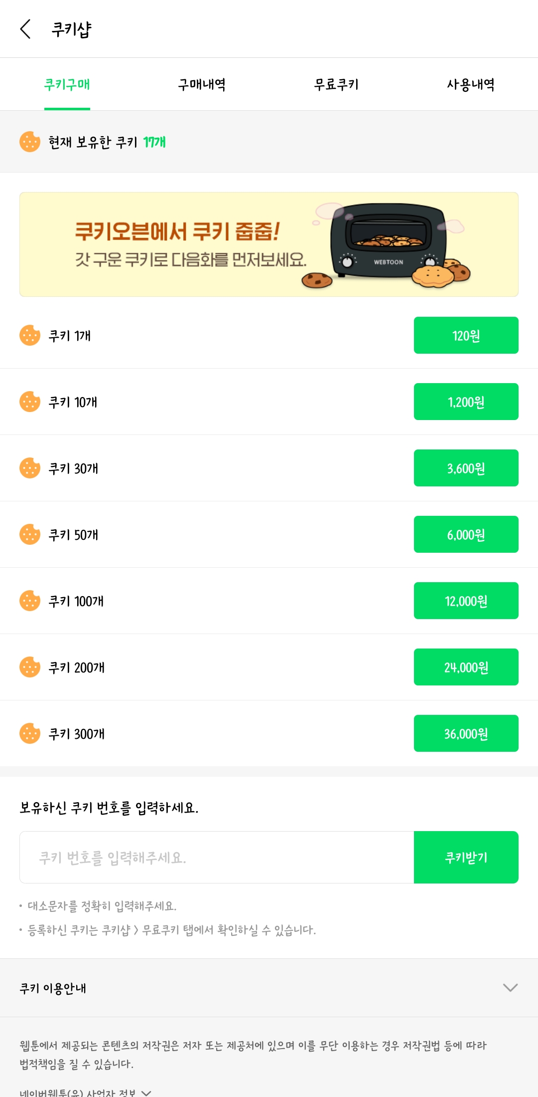 네이버웹툰 쿠키는 웹과 앱스토어 결제 가격이 다르게 책정됩니다.