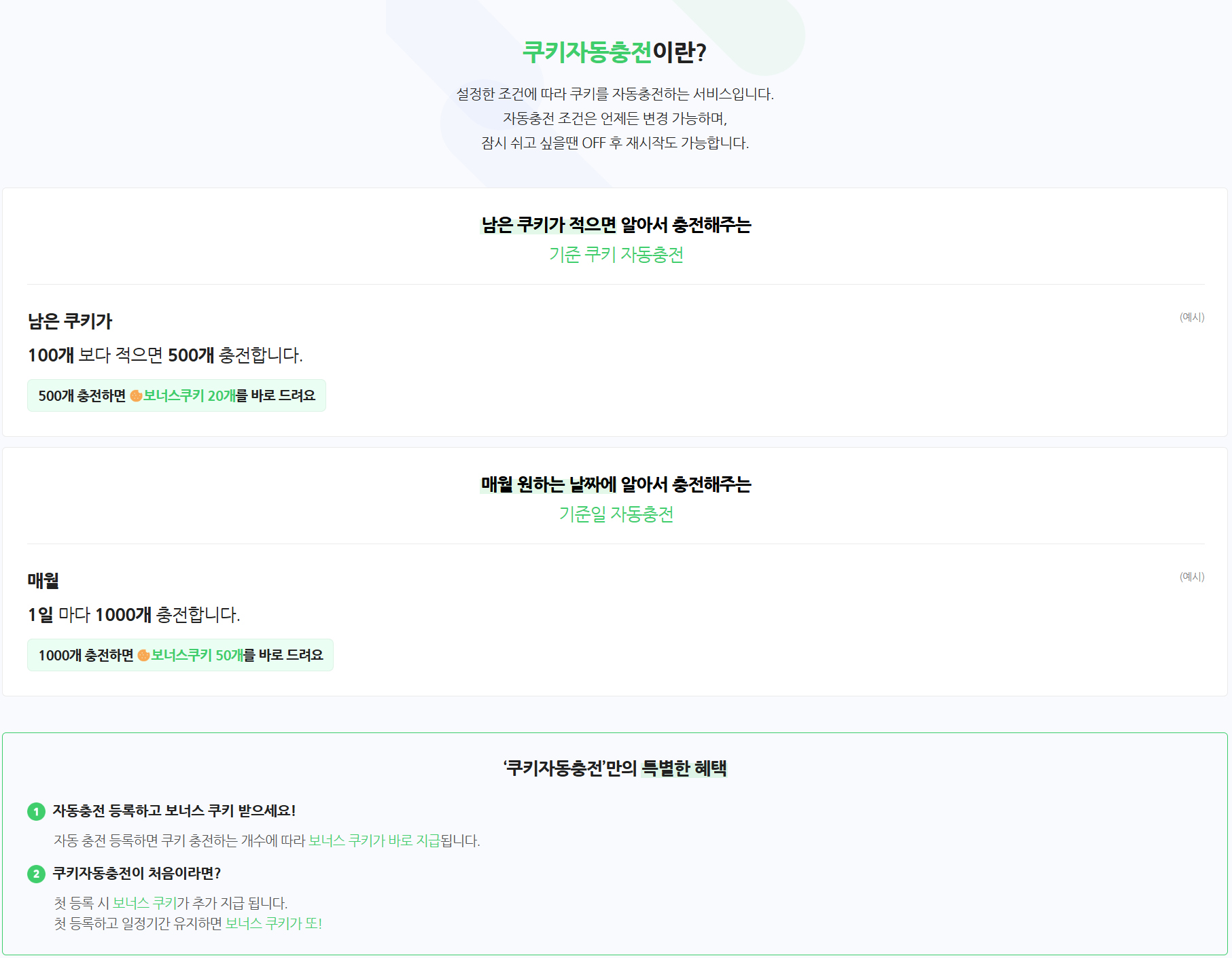 - 적립된 포인트로 쿠키 충전 시 추가 결제 비용 ↓