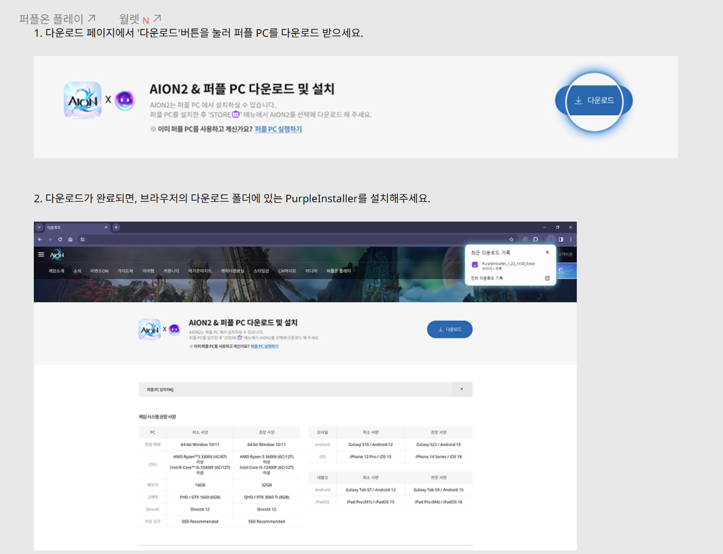 아이온2 PC 플레이(PURPLE) 기준 권장 사양입니다.