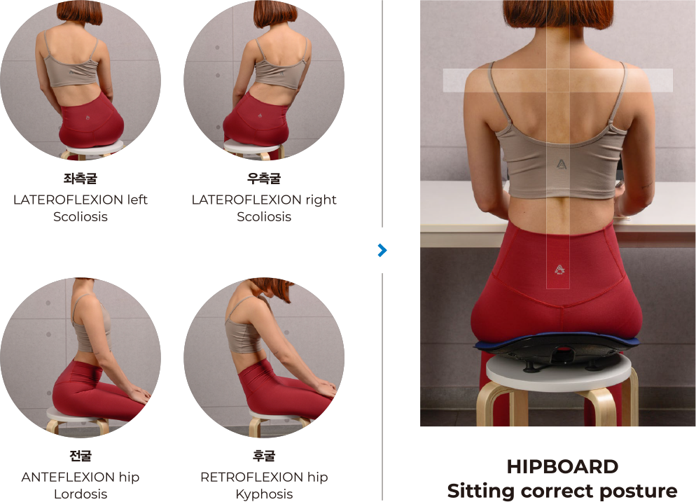 - 앉는 습관 변화 : 평소 엉덩이 뒤로 기대거나 다리를 꼬는 습관이 있는 분에게 좀 더 바른 앉은 자세 유도