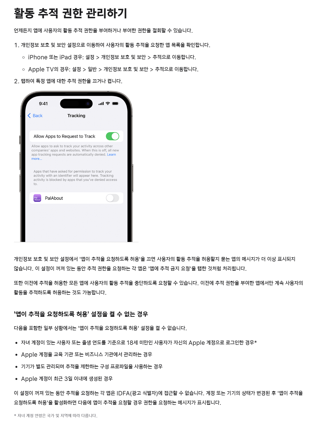 - 스크린타임·자녀 보호 설정 확인 : '콘텐츠 및 개인정보 보호 제한'이 걸려 있으면 추적 기능 비활성화됨