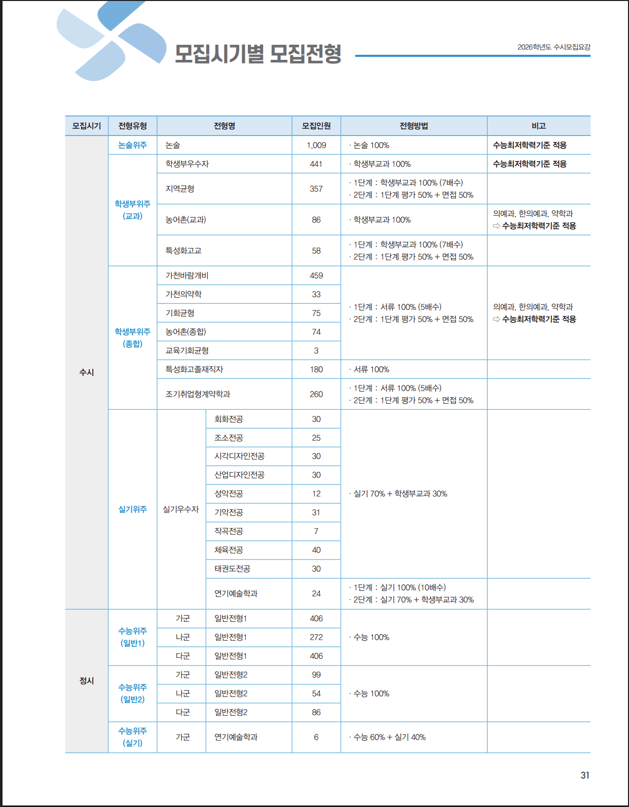 - 논술 전형: 논술고사 실시함 (지금까지는 날짜 지정, 영역 및 문제 유형 공개됨). 논술 점수 + 학생부 혹은 수능 최저 등이 같이 반영됨.