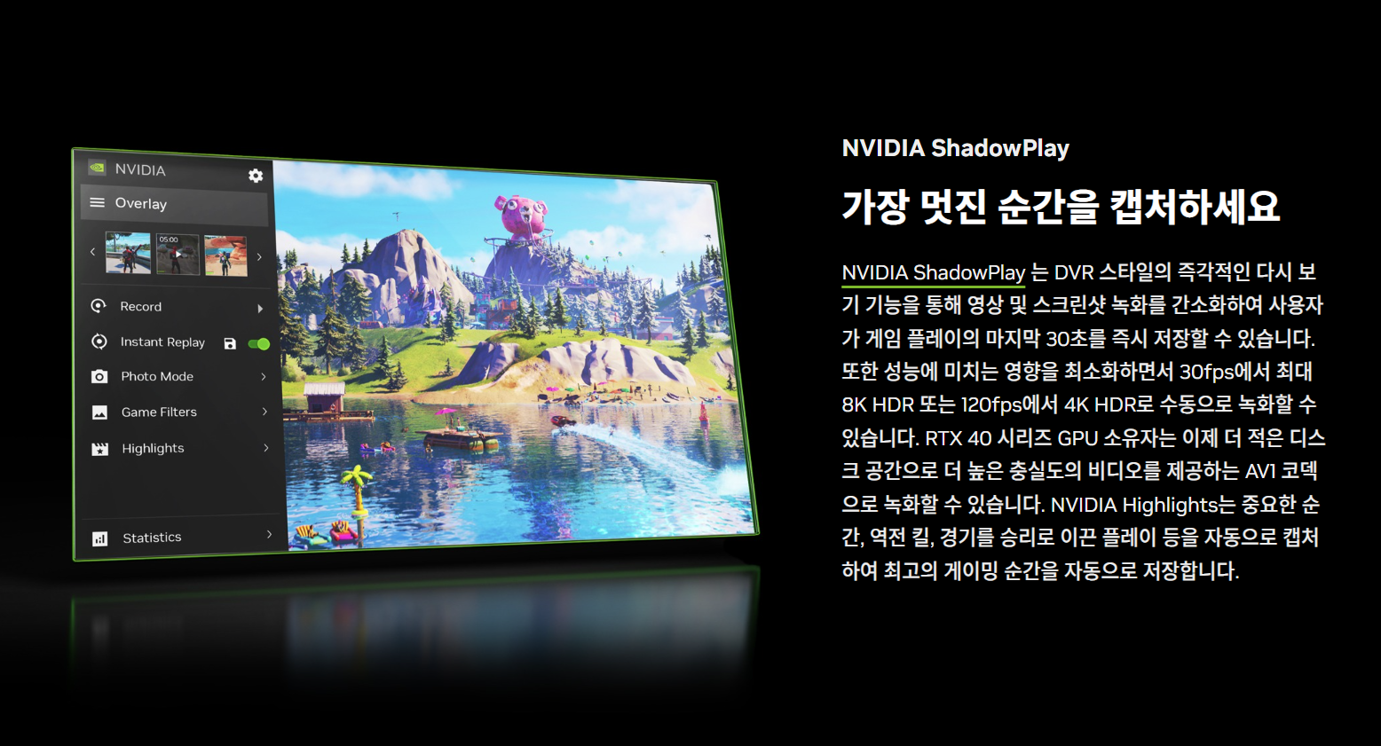 - ShadowPlay(섀도우플레이) 기능으로 화면 녹화 및 스트리밍 가능