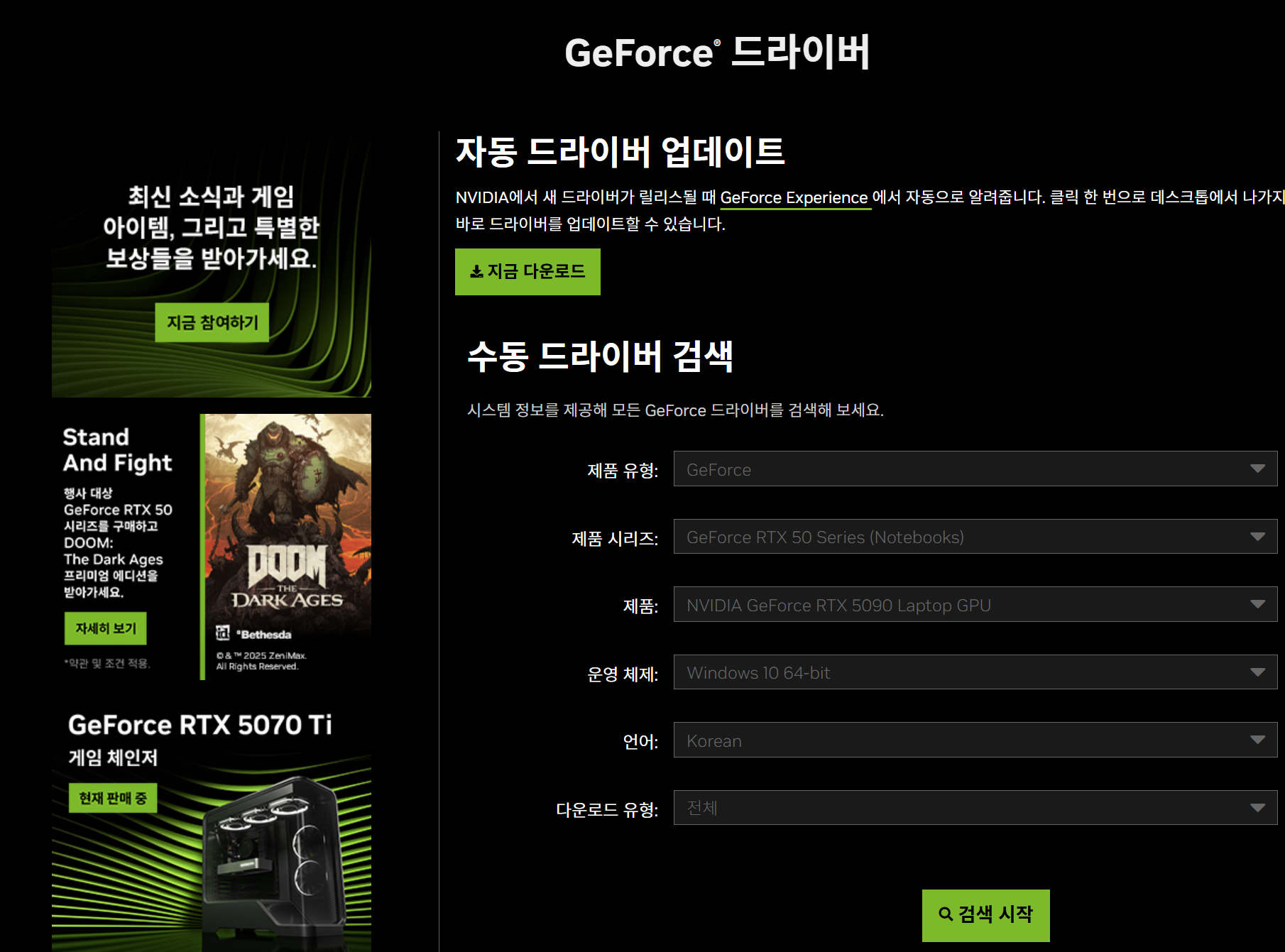 - 그래픽카드 모델과 운영체제를 선택 후 직접 다운로드 가능