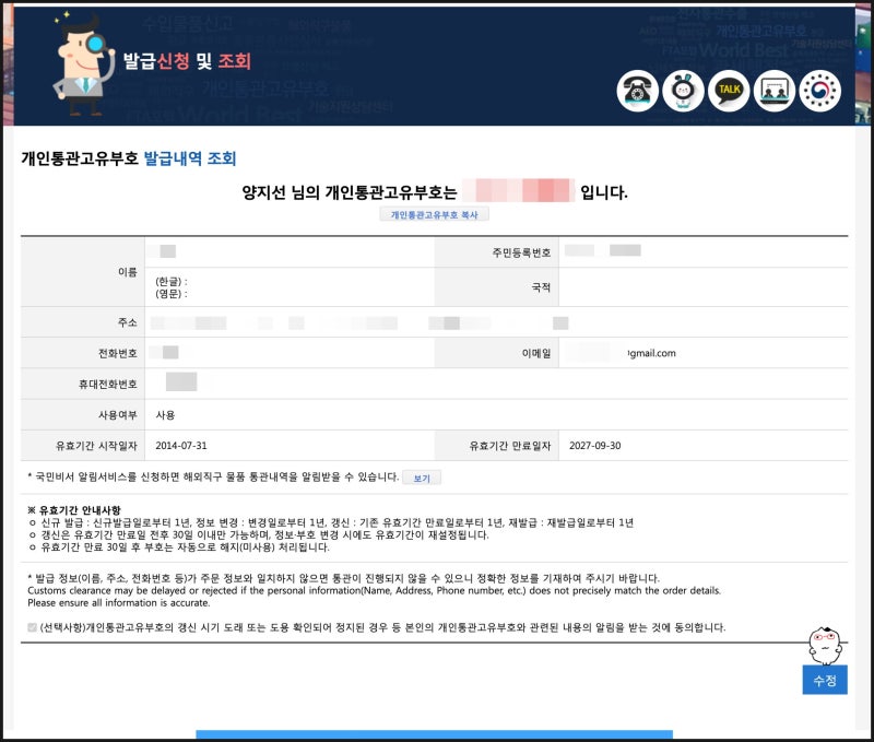 ✔ 통관번호 재발급 기간은 실시간 발급, 지연 없음
