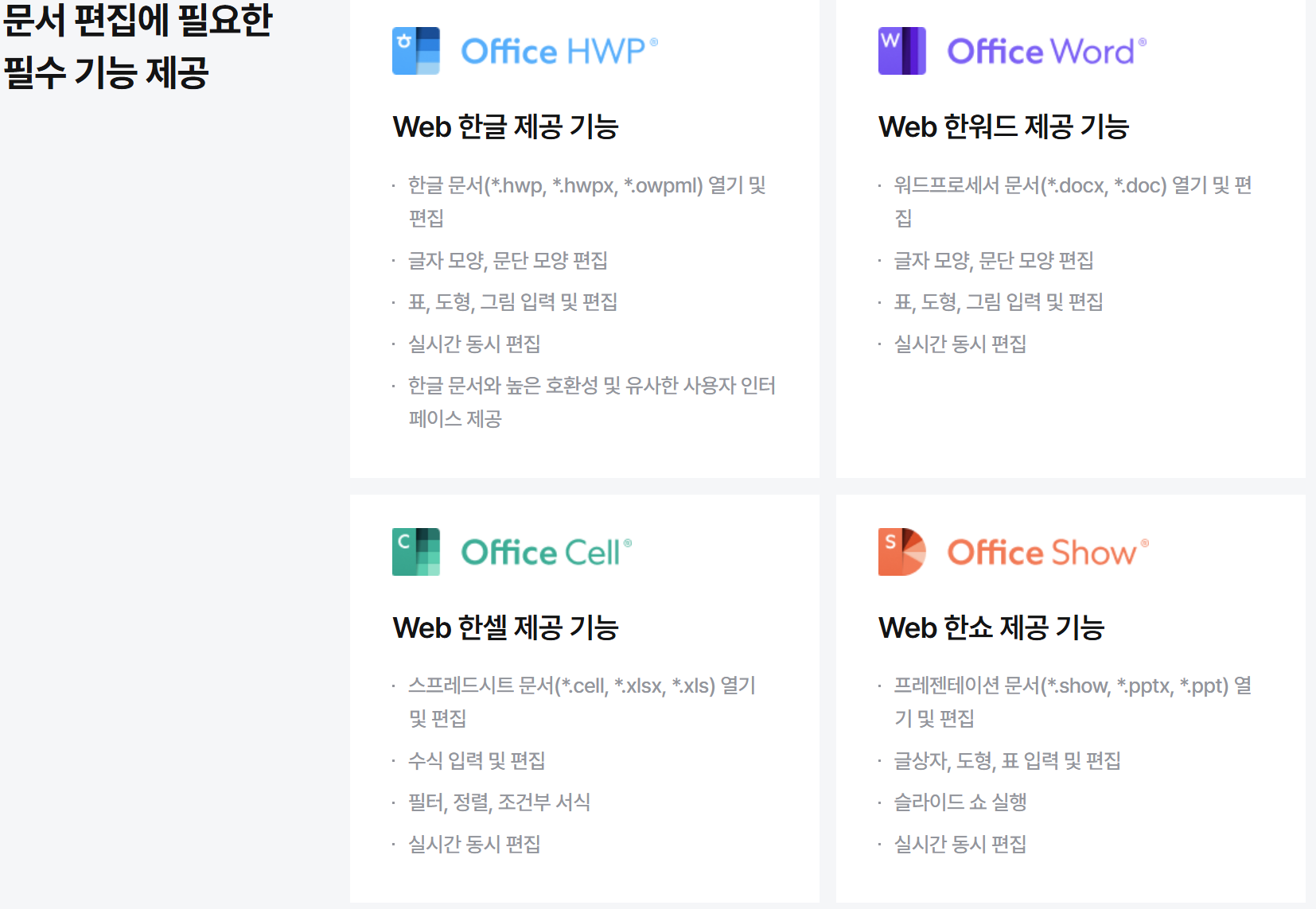 | 웹 연동 | 미지원 | 웹 한컴 완전 지원 |