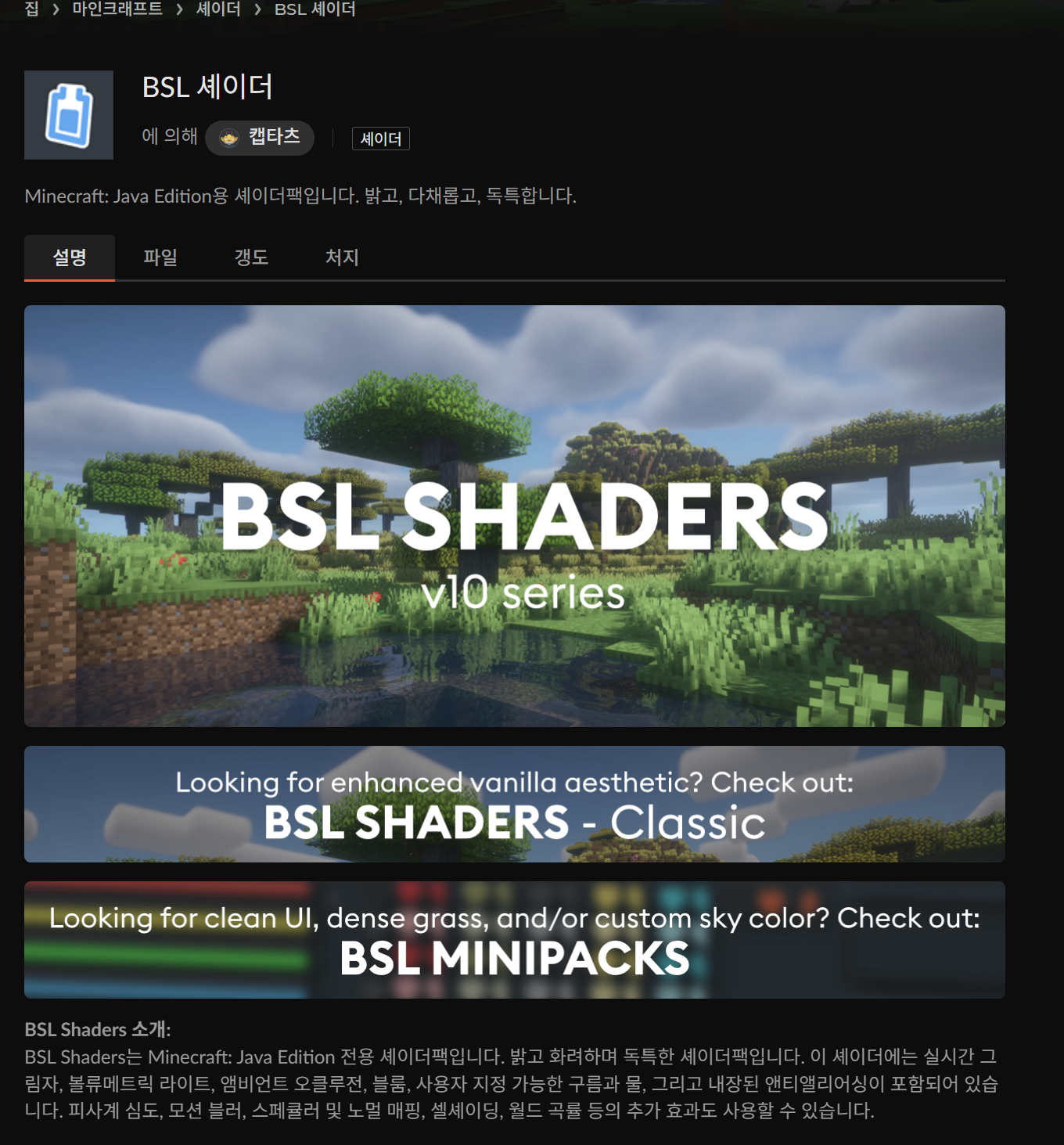 https://www.curseforge.com/minecraft/customization/bsl-shaders - Complementary Shader 공식 페이지
