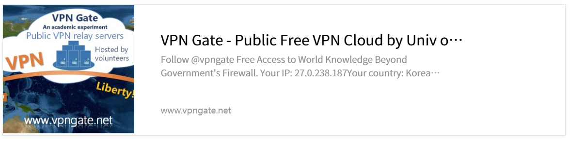 | 오픈소스 | VPNGate | 가입 없이 서버 선택만으로 vpn사용법 완료 |