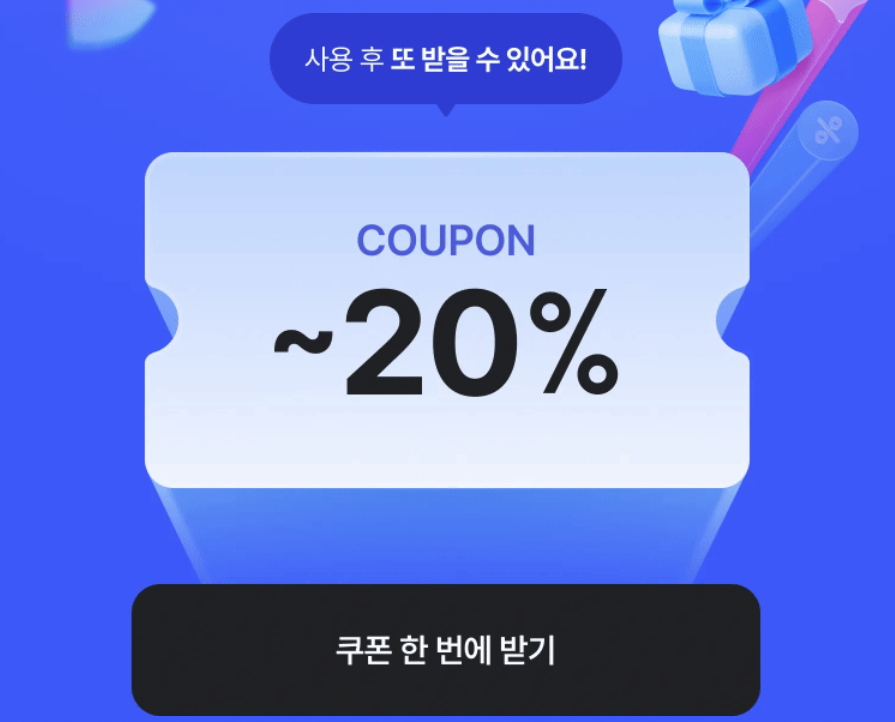 - 타임쿠폰 팩 (전 품목 10%, 카테고리별 최대 20%) 제공