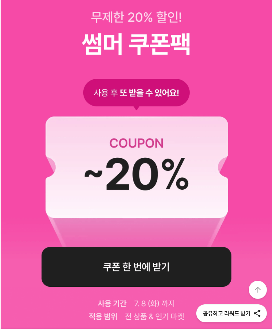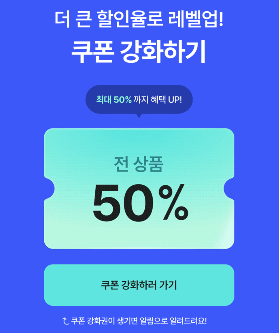 - 선착순 하루 300명 대상 50% 전 상품 쿠폰 (7/1~7/3 낮 12시)