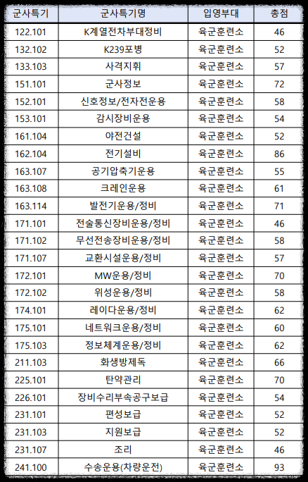전공과 기술행정병 분야가 일치할수록 높은 점수(평균 6~10점)를 받습니다.