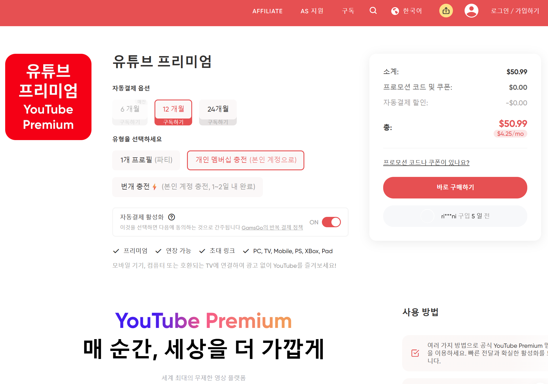 ✅ 1-1. 겜스고 유튜브프리미엄 충전 절차