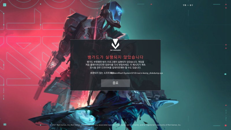 - 다른 게임용 안티 치트 프로그램 설치돼 있다면 종료 후 발로란트 실행