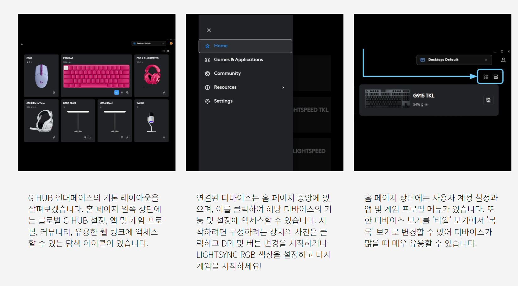 - G HUB → 장치 목록 우측 상단