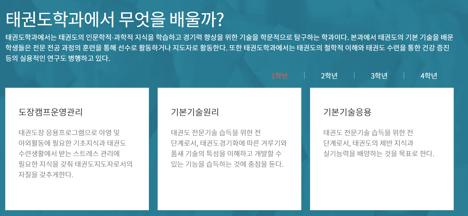 - 경쟁률: 태권도학과 수시 일반학생 전형은 약 11~17 : 1로 매해 높은 편