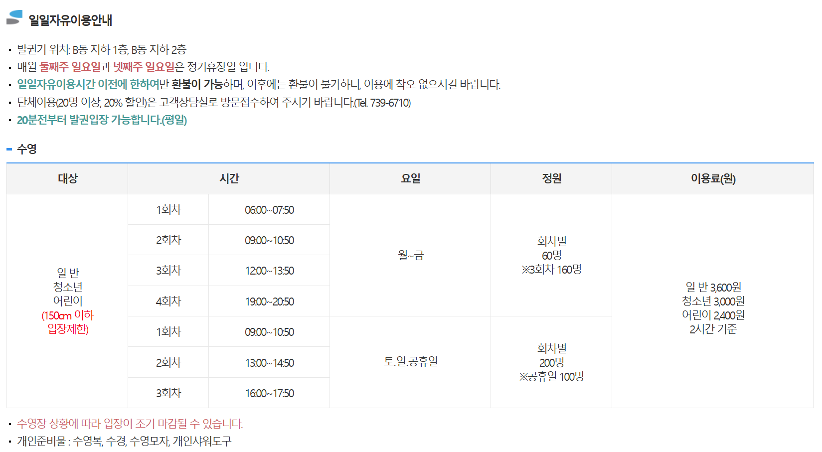 - 일요일 자유수영 가능여부: 둘째·넷째 주 일요일은 시설점검 및 휴관이 있으니, 홈페이지 공지 확인이 필수