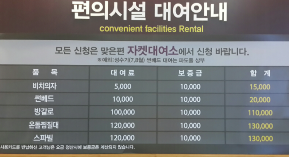 | 수영복 대여 | 가능 (현장 5,000~8,000원) |
