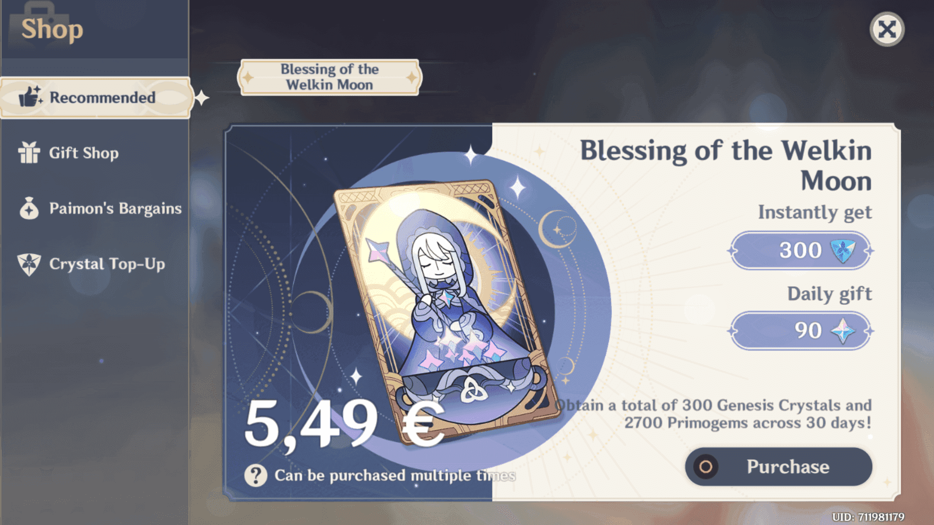 - 원신 과금 효율표 1위 = 달의 축복, 2위 = 배틀패스