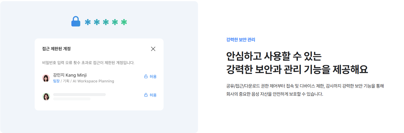 - 기업용 클로바노트는 Admin 페이지에서 구성원별 잔여시간, 변환 시간, AI 요약 횟수 등 실시간 관리 가능