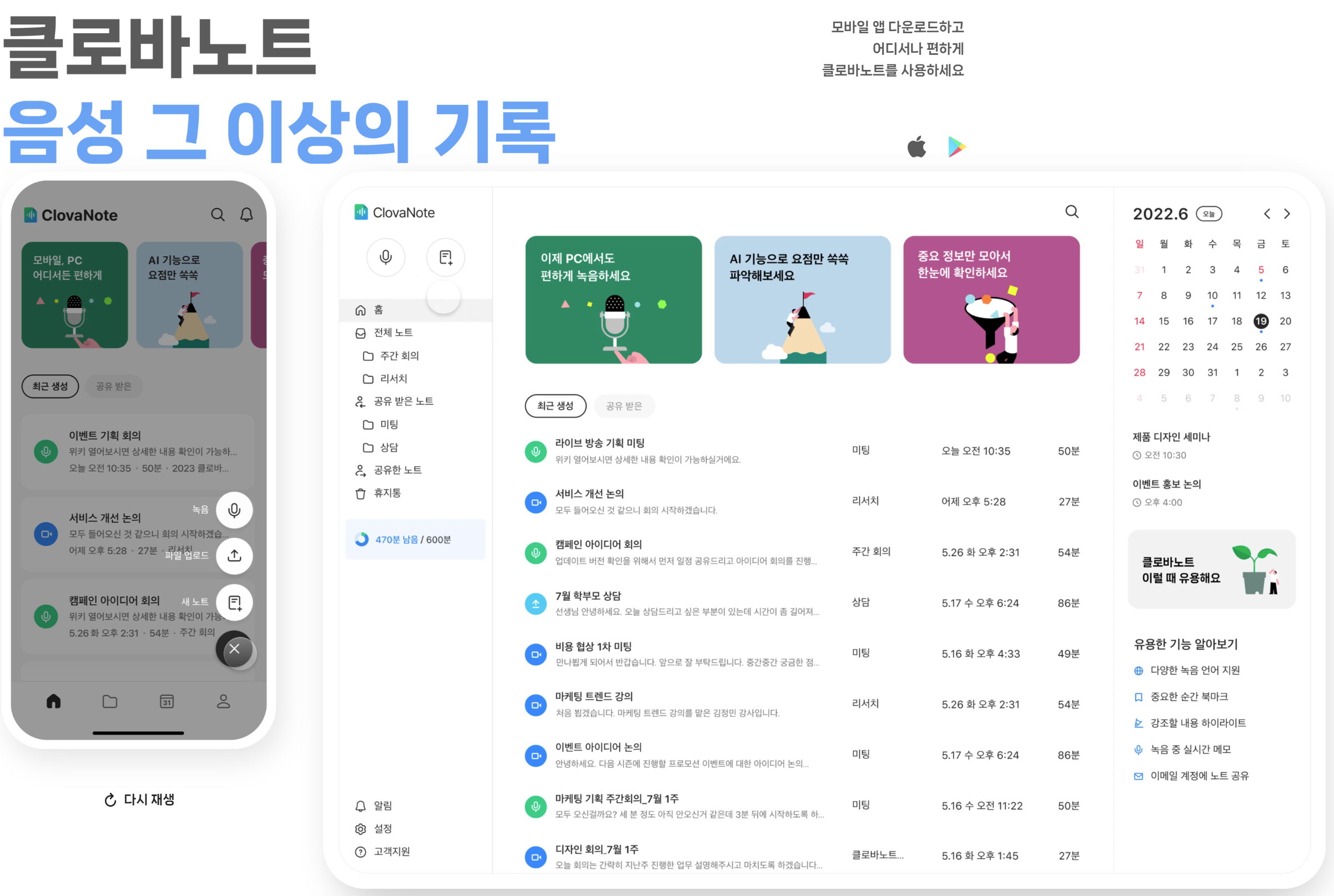 - 음성텍스트 변환: PC버전에서 마이크 녹음 또는 파일 업로드로 녹취 → 자동 텍스트추출