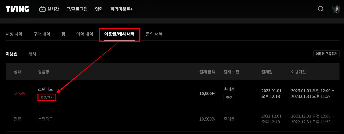 티빙 결제수단 변경은 현재 구독을 먼저 ‘해지’한 후,