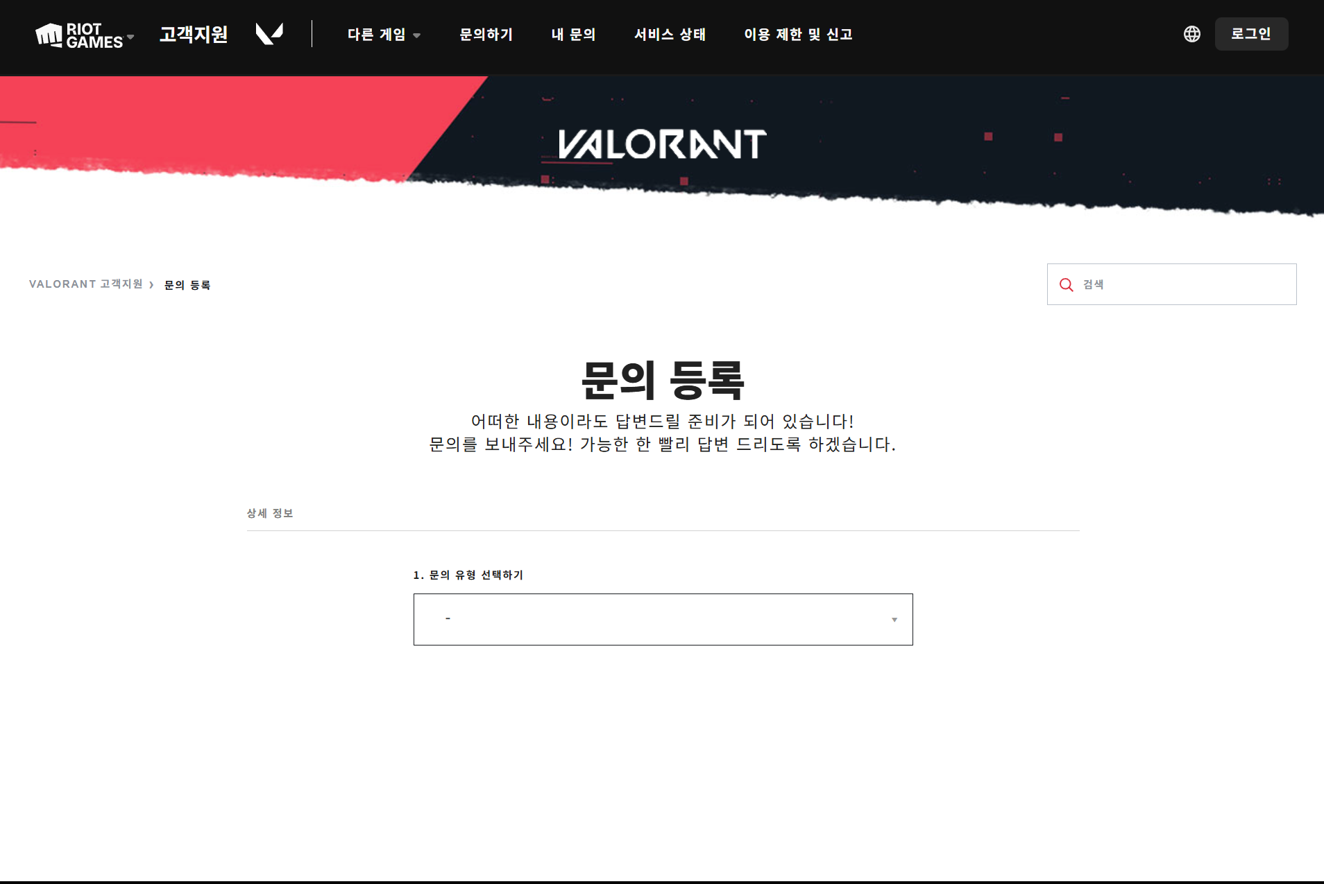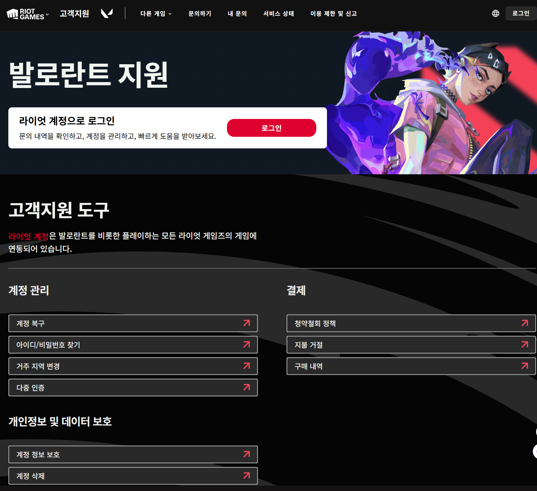 발로란트 계정 관련 문제는 반드시 아래 공식 페이지에서 해결해야 합니다.