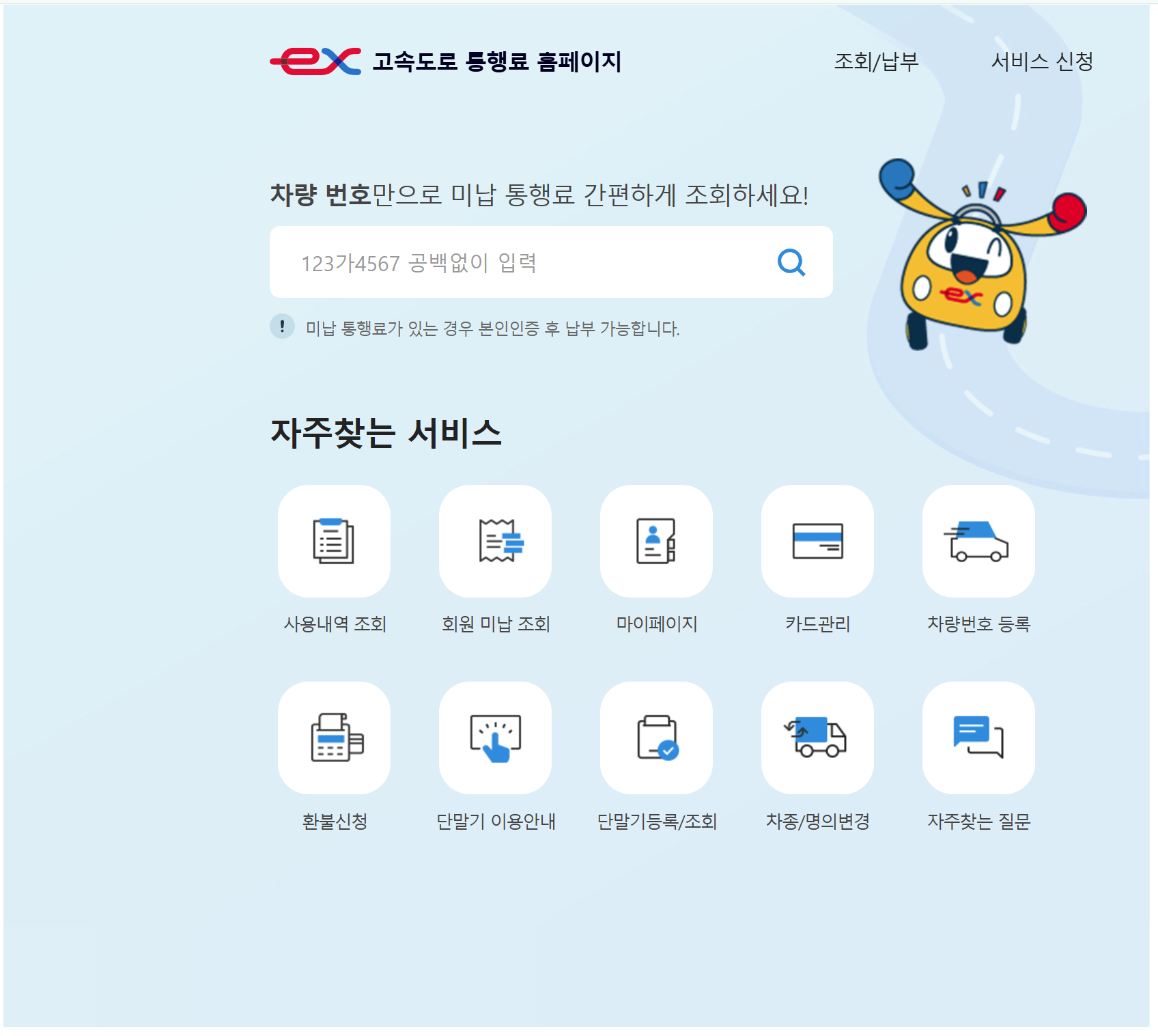 예, 차량번호 + 본인 인증만으로 미납요금 조회납부 가능