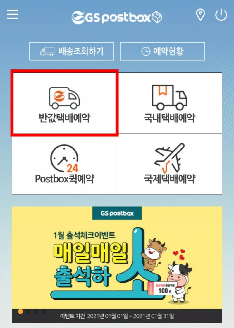 - 키오스크 화면 → 반값택배 클릭