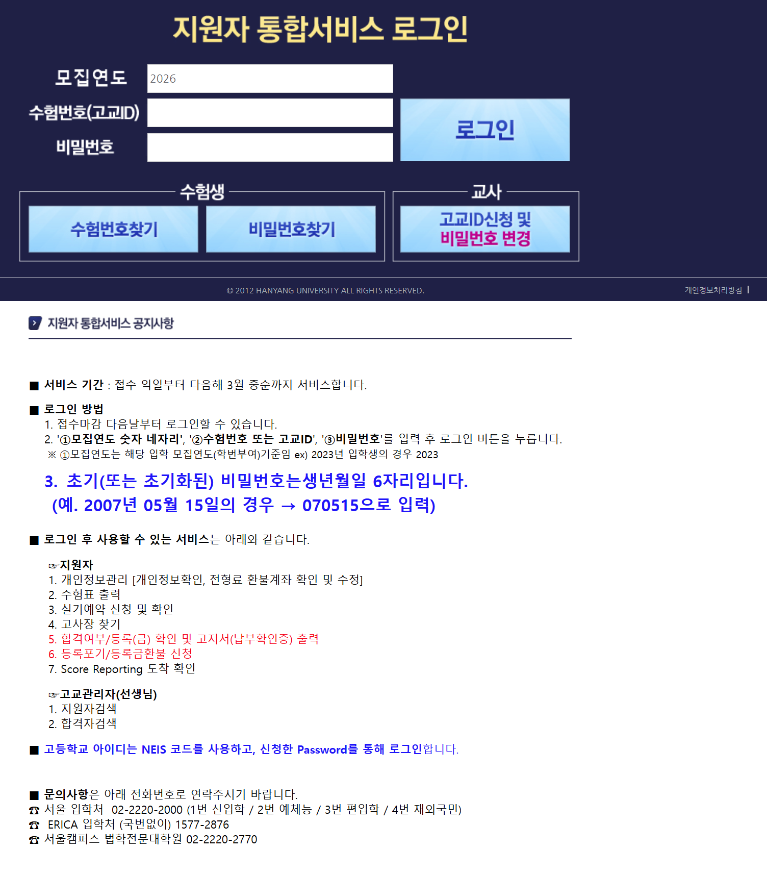 https://portal.hanyang.ac.kr/ipsi/findLoginPage.do → 합격자 발표(지원자 통합서비스 로그인)